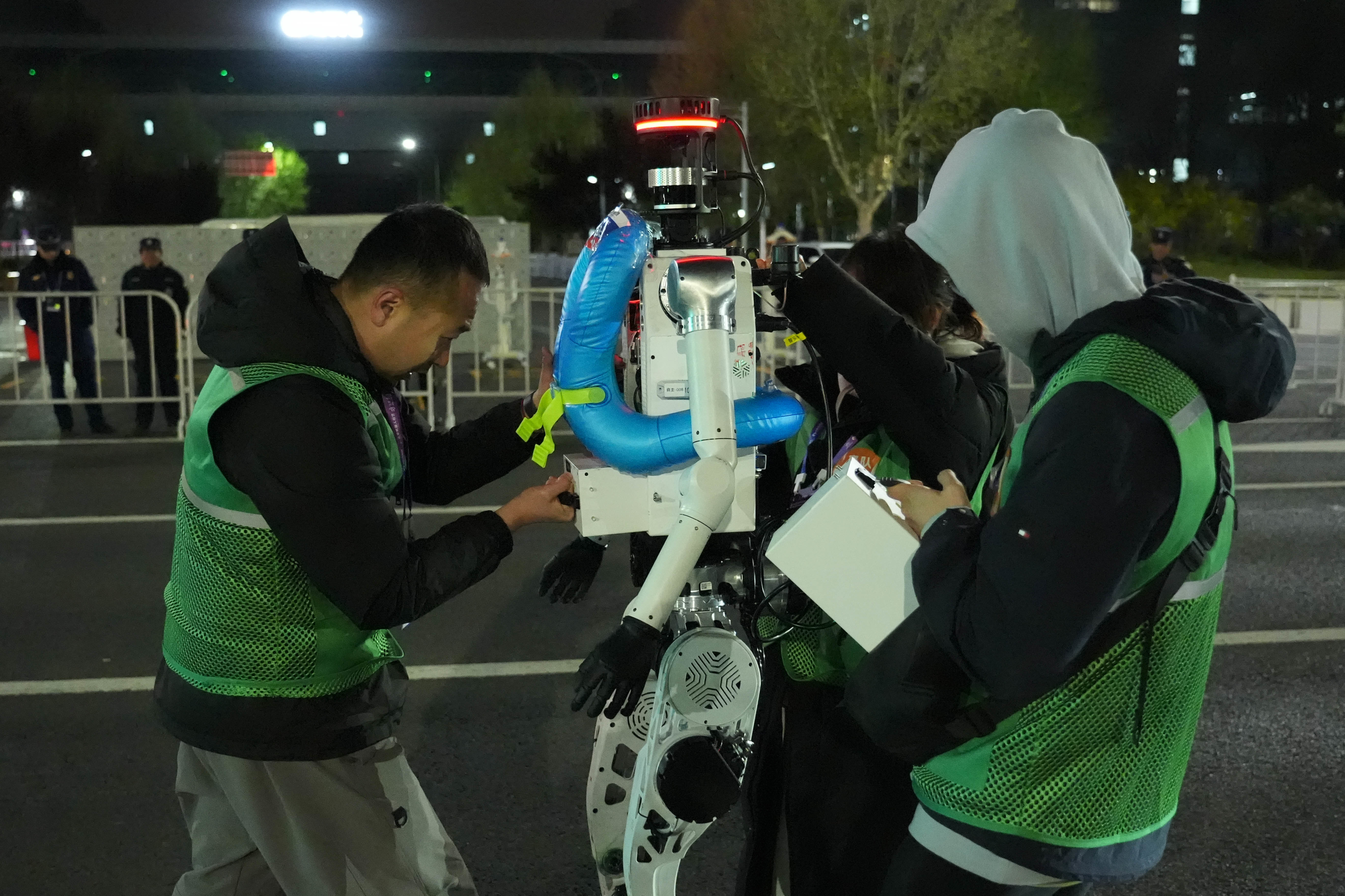 4月11日,工作人员在测试活动中为一台机器人更换电池。新华社记者 谢晗 摄